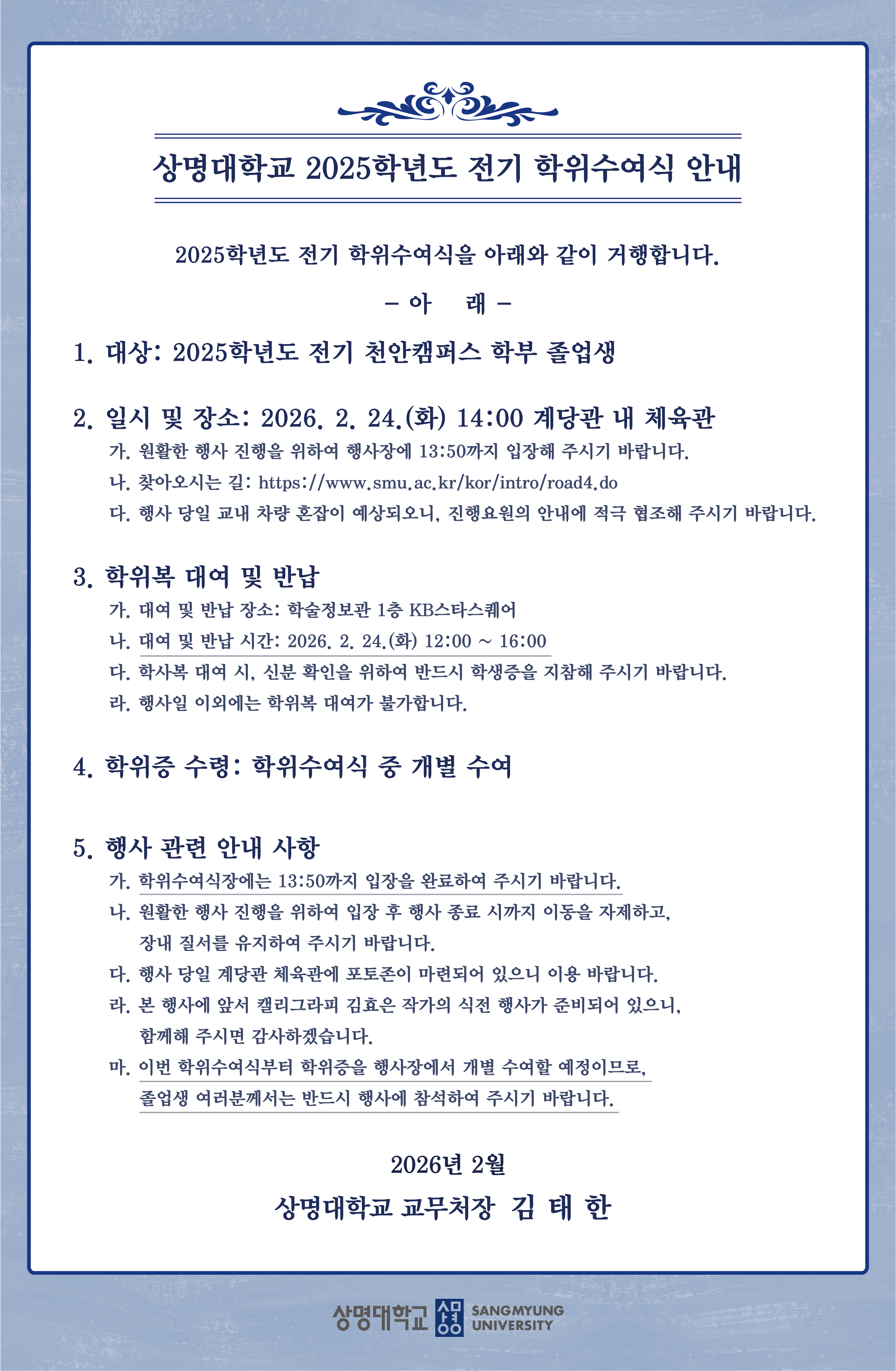 ※ 행사 중 학위증서 수여 순서에서는 총장님께서 직접 학위증을 수여하실 예정입니다.